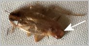 Only about ½ inch in length, the German cockroach can be tan to brown to almost black, and has two dark parallel streaks running from the head to the base of the wings.